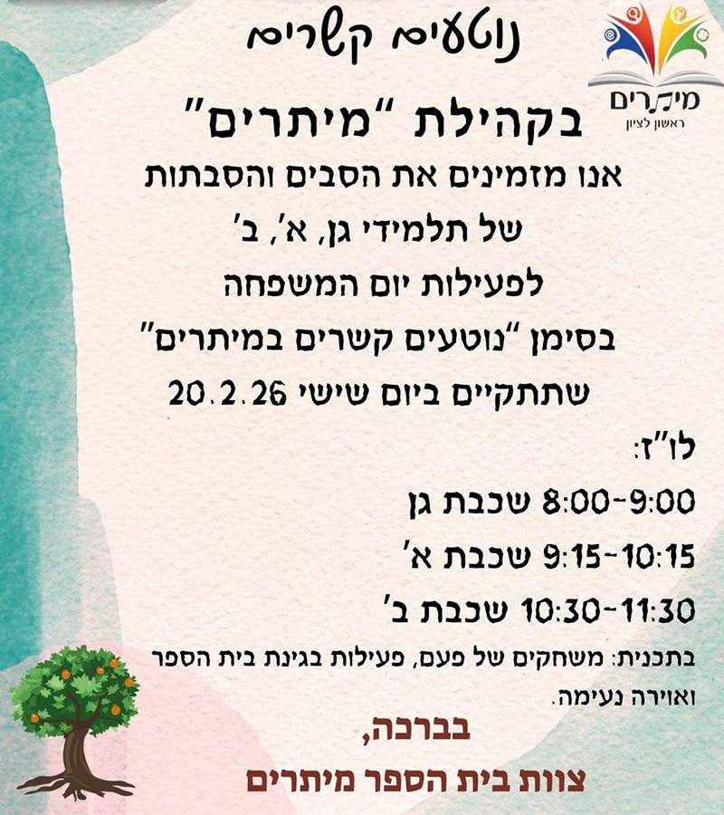 אנו מזמינים את הסבים והסבתות לפעילות יום המשפחה בסימן “נוטעים קשרים במיתרים” בחרו את הכיתה: תלמידי גן, א', ב' תלמידי ג', ד', ה', ו'
